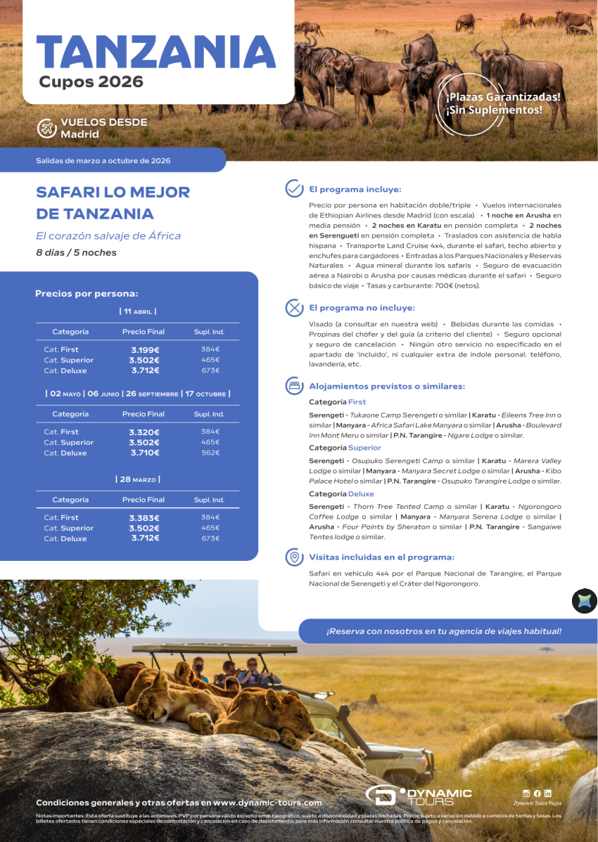 TANZANIA 【Safari lo mejor de Tanzania】『8 días / 5 noches』(✈ Madrid) desde 3.199€